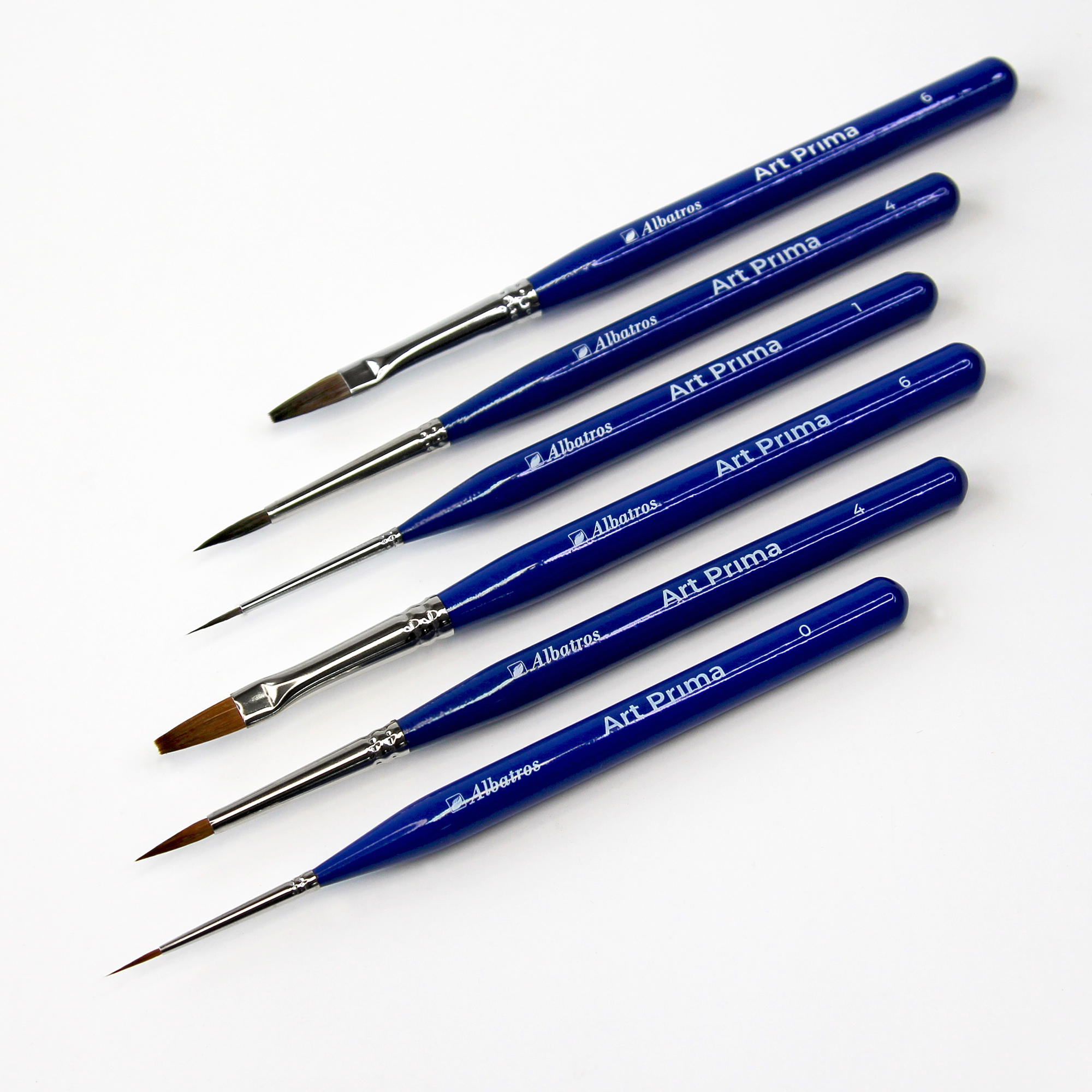 Серия кистей «Art Prima» представлена круглыми и плоскими кистями микс соболь/синтетика и микс колонок/синтетика. Цельнотянутая медная обойма с двойным обжимом, короткая эргономичная ручка синего цвета.